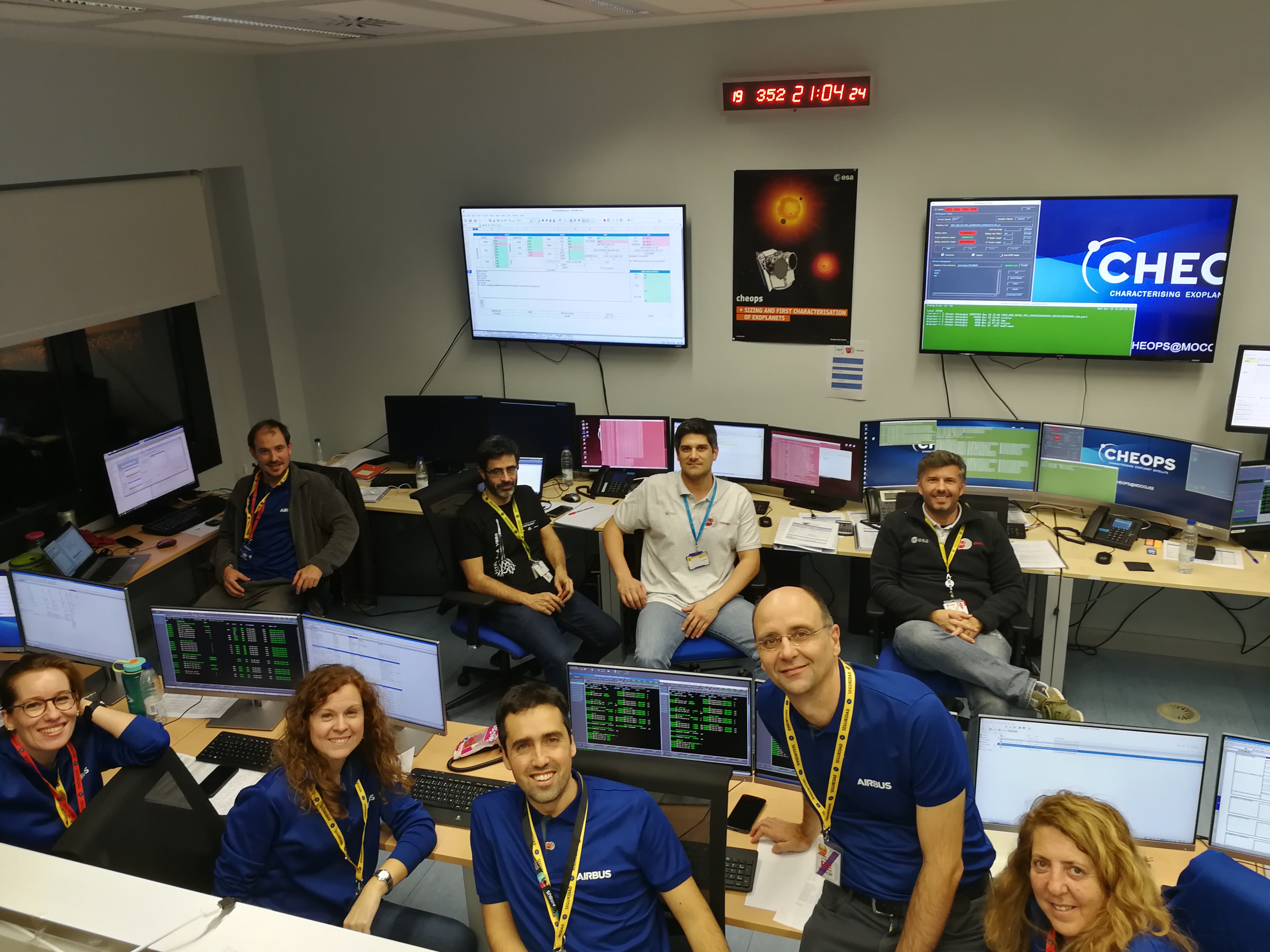 The CHEOPS team on 18 December 2019 in the Mission Control room during the Launch and Early Orbit Phase (LEOP) at the Mission Operations Centre (MOC) at INTA in Torrejón de Ardoz, near Madrid, Spain.
