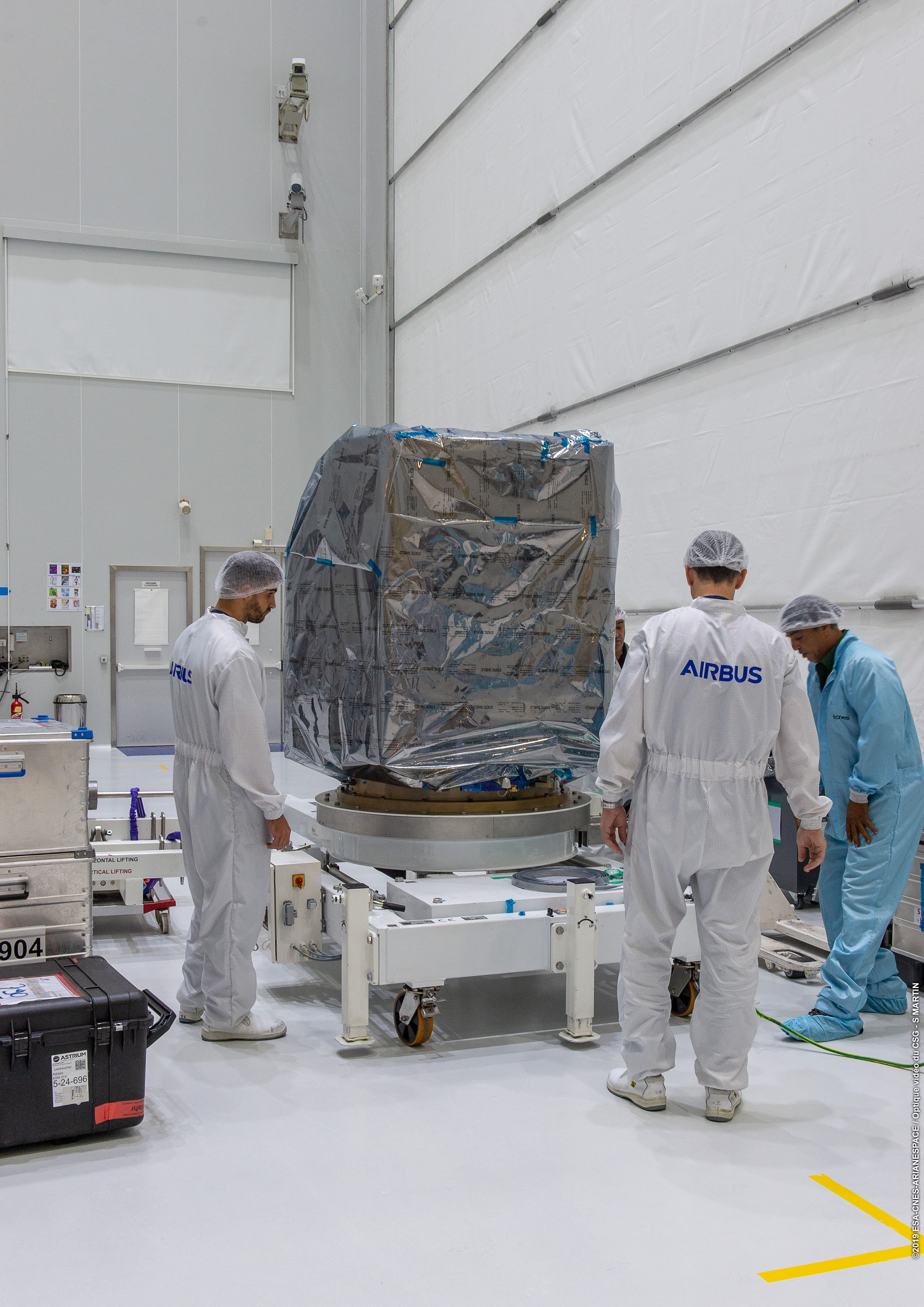 Following completion of propulsion module leak tests at Europe's Spaceport in Kourou, French Guyana, the CHEOPS satellite is being readied to move from the High Bay Facility of S5C to the S5A building, where propellant fuelling will take place.