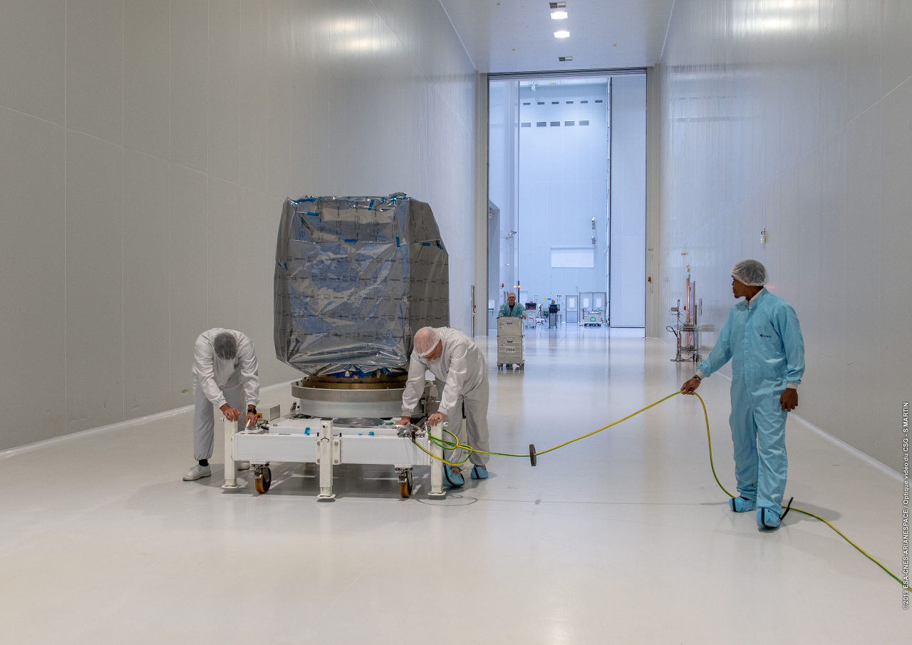 The CHEOPS satellite during transfer from building S5C to the payload facility of S5A through the internal corridor, as part of launch preparations at Europe's spaceport in Kourou, French Guyana. The satellite is being moved on its multi-purpose trolley under the supervision of Airbus staff and with the support of the spaceport team. During all phases, a dedicated plastic bag protects the satellite and its payload from contamination.