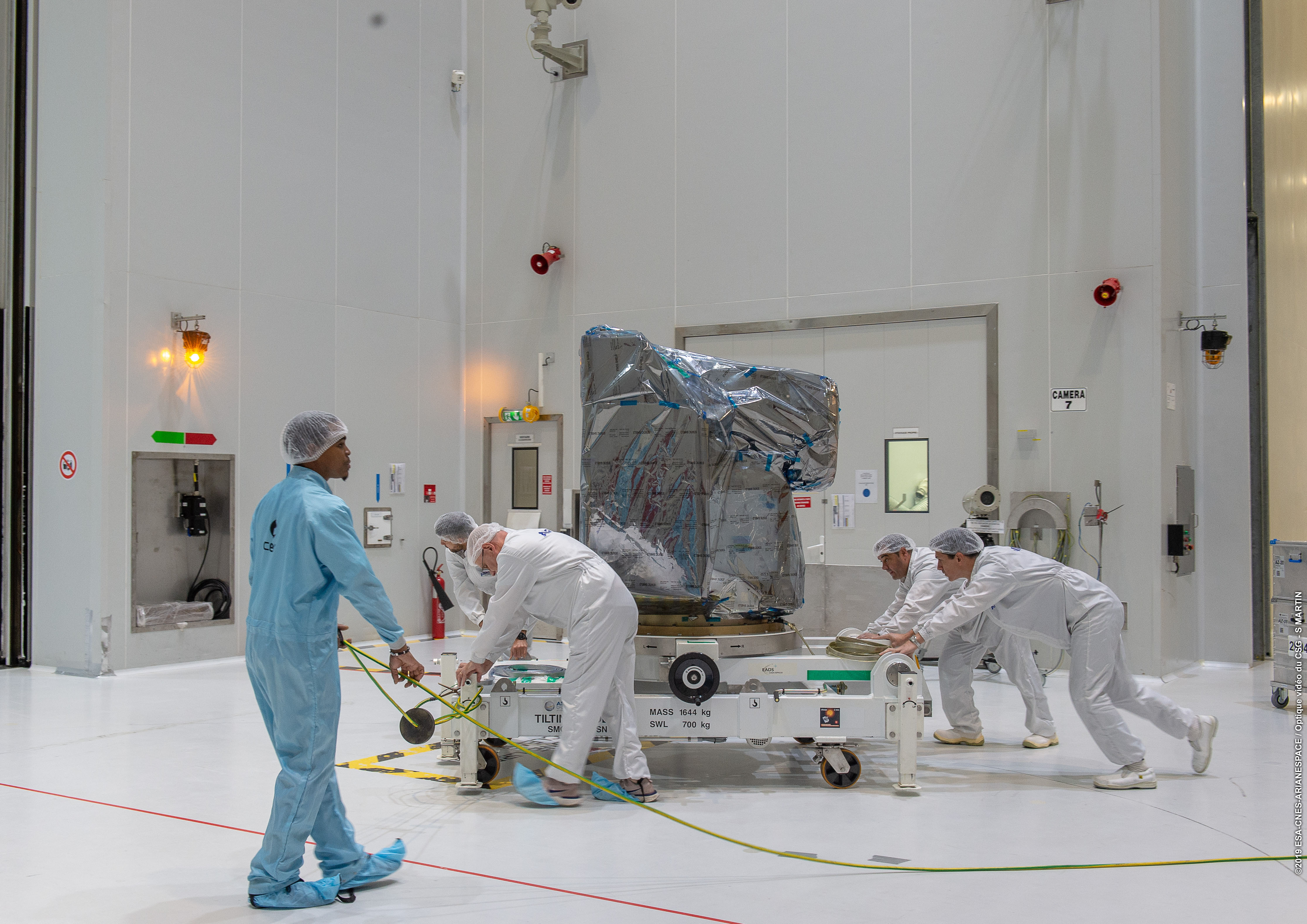The CHEOPS satellite during transfer from building S5C to the payload facility of S5A through the internal corridor, as part of launch preparations at Europe's spaceport in Kourou, French Guyana. The satellite is being moved on its multi-purpose trolley under the supervision of Airbus staff and with the support of the spaceport team. During all phases, a dedicated plastic bag protects the satellite and its payload from contamination.