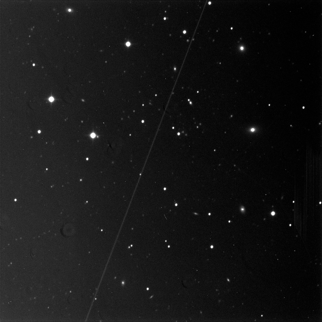 The coordinates of the centre of this 2048 × 2048 pixel image are: right ascension 11h 56m 58.00s and declination +27° 30' 45.0" (J2000). The visible trail seen running from bottom to top in the image is due to sunlight reflected by the CHEOPS spacecraft, which is in a sun-synchronous orbit with an altitude of 700 km and a local time of the ascending node of 6:00am.
