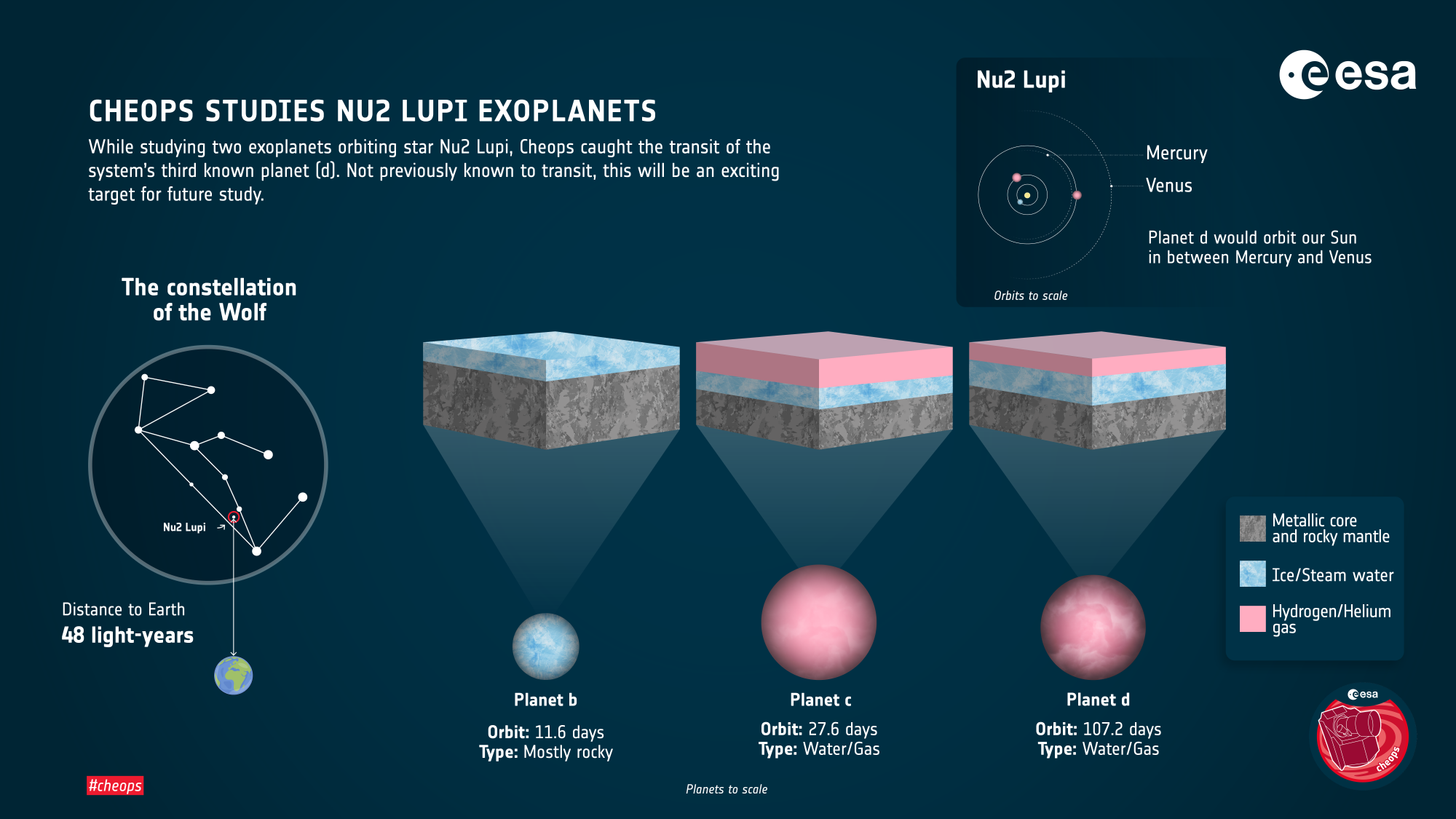 This infographic reveals the details of the Nu2 Lupi planetary system, which was recently explored by ESA's exoplanet watcher CHEOPS (CHaracterising ExOPlanet Satellite).