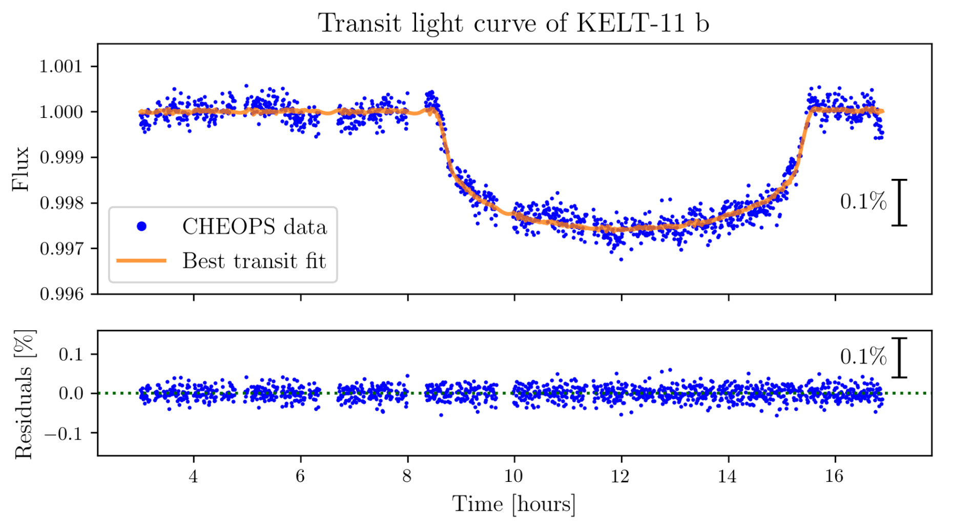During its in-orbit commissioning, ESA's CHEOPS mission observed a transit of KELT-11b in front of its host star. The light curve of this star shows a clear dip caused by the eight hour-long transit of KELT-11b, which enabled scientists to determine very precisely the diameter of the planet: 181 600 km – with an uncertainty just under 4300 km.