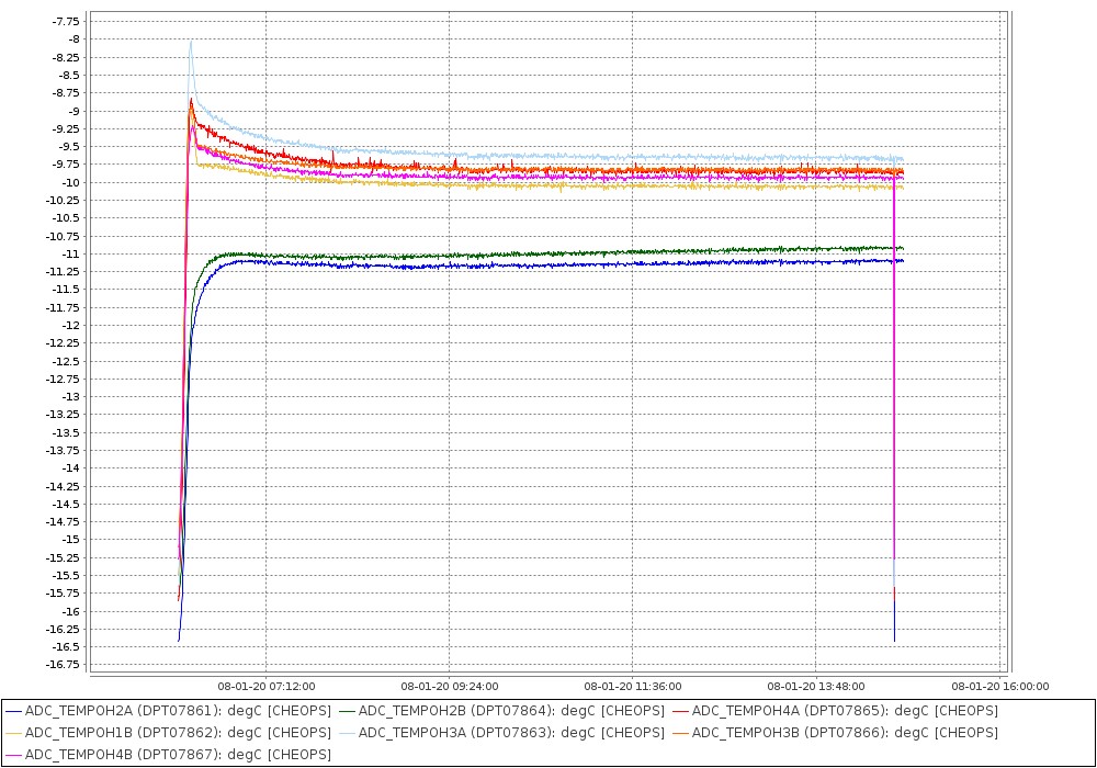 The science instrument on board ESA's Characterising Exoplanet Satellite, CHEOPS, was switched on for the first time on 8 January 2020 as part of the in-orbit commissioning phase and commanded to pre-science mode, activating the application software that started heating the telescope tube. This graph shows how the temperature is controlled at different positions in the telescope structure.