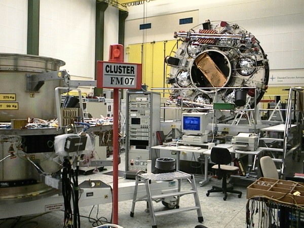 Cluster II: FM7 (front left) in the clean room at the Dornier Satellitensysteme plant in Friedrichshafen, Germany. FM 6 can be seen upright in the background.