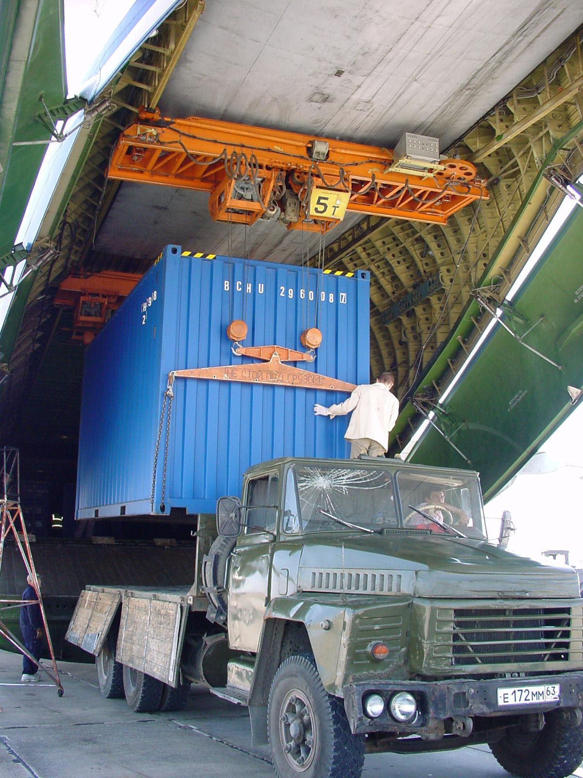 Hoisting of the equipment containers out of the Antonov plane (first of 2 shipments).