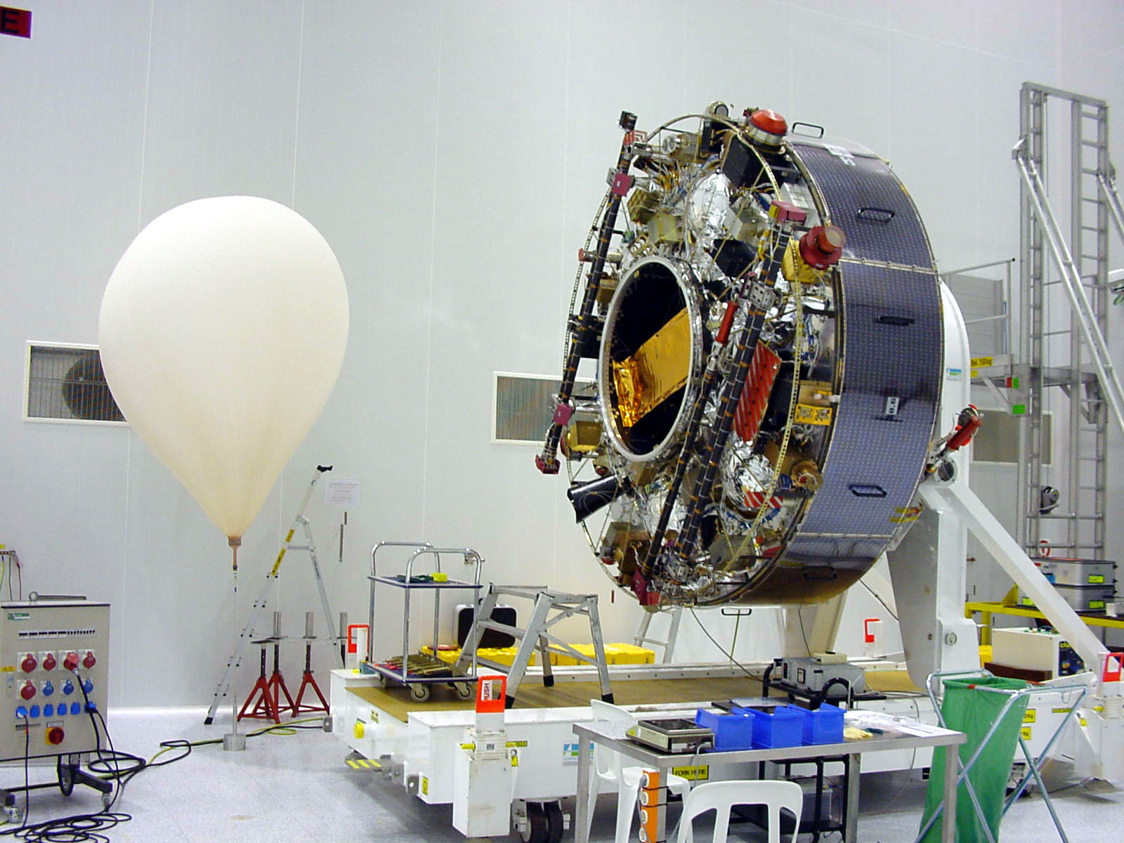 FM8 in the Payload Processing Facility. The balloon in the picture is used to compensate for gravity during on-ground deployment of the FGM experiment boom.
