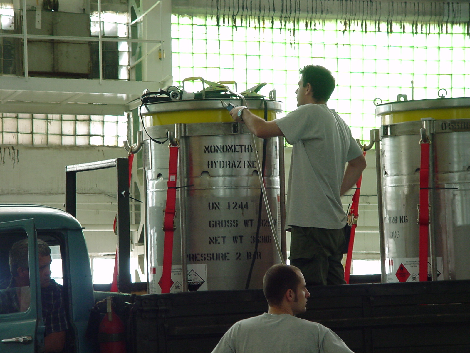 After finishing filling of the FM 6 and FM 7 spacecraft with the NTO oxidiser, it was time to remove the empty NTO containers from the HPF and replace them with MMH fuel containers. At the same time additional helium bottles were transferred to the HPF.