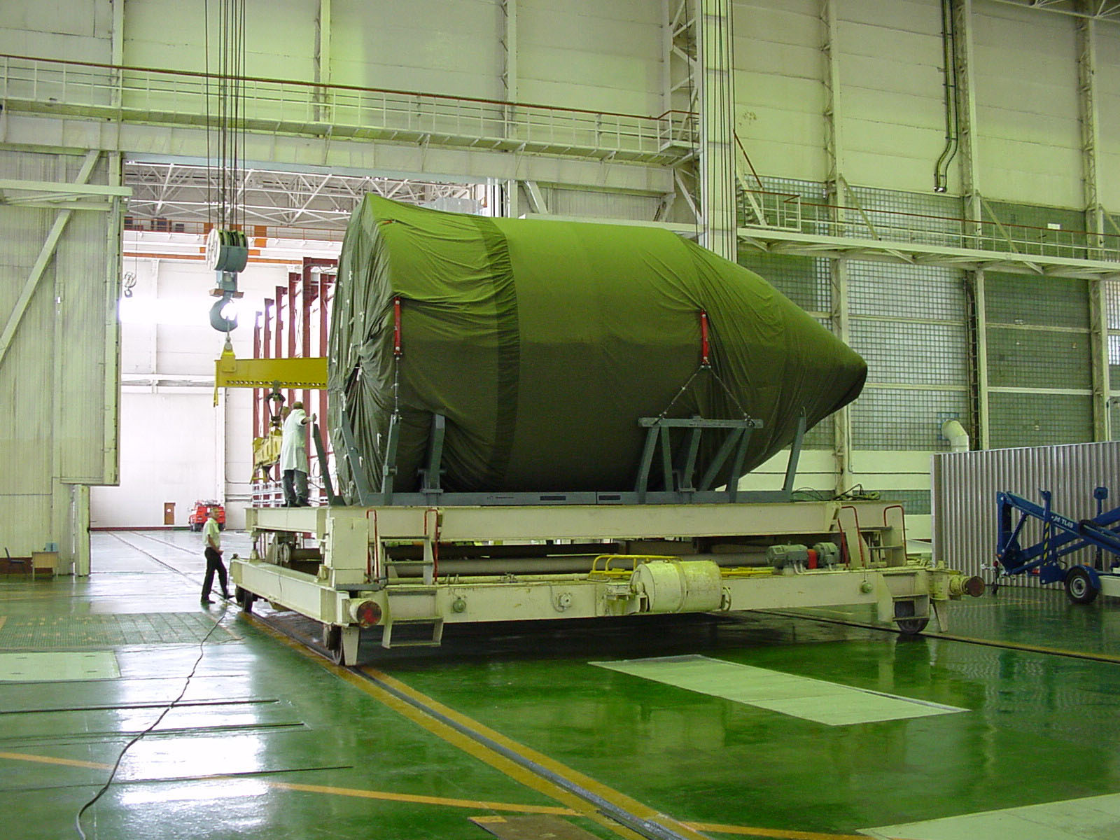 The rocket fairing has arrived in the Energia building. It has been transported next to the Upper Composite Integration Facility (UCIF) clean room, which it will enter in a few days after being cleaned.