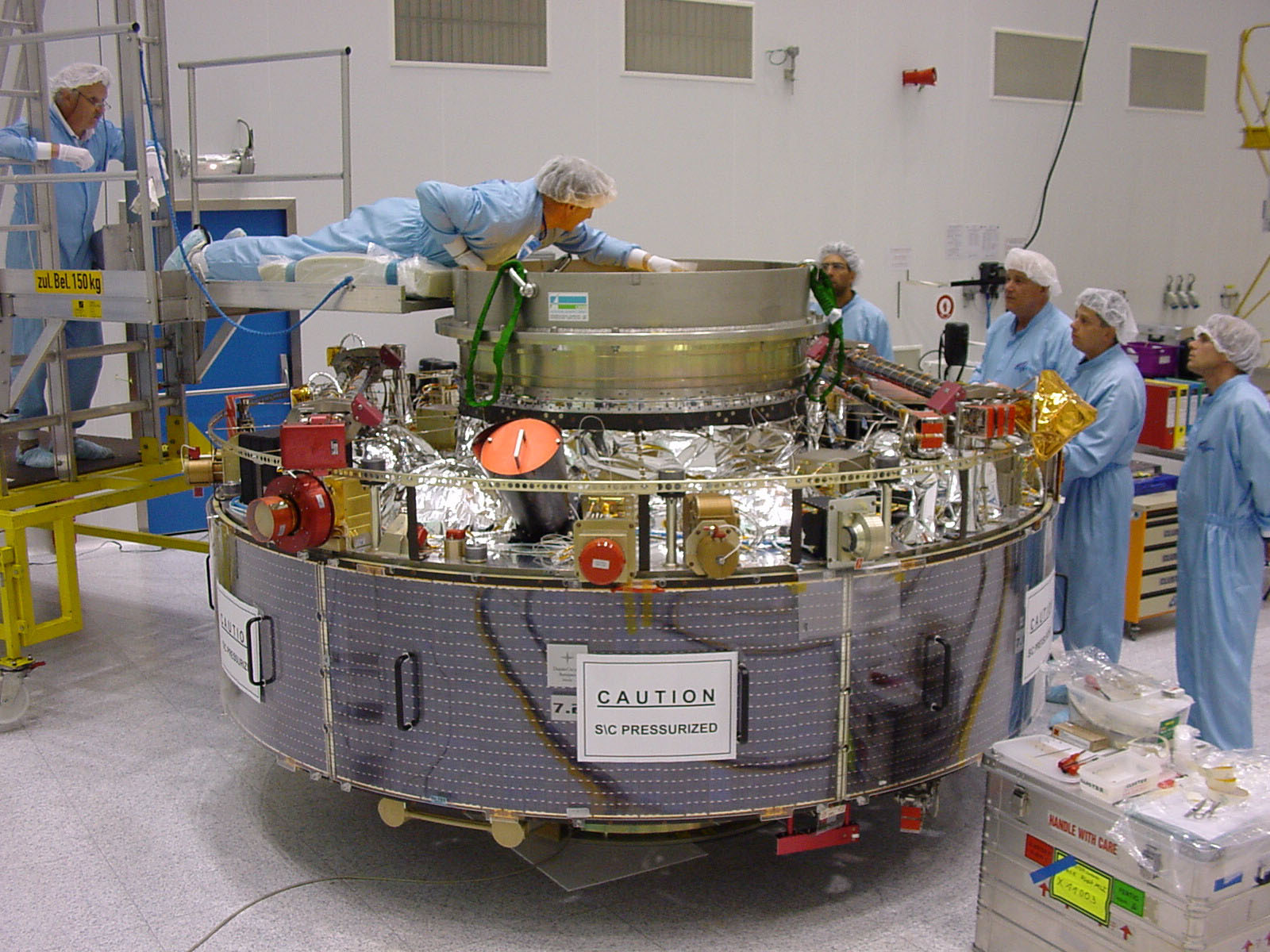 Installation of the thermal blanket on the upper platform of the spacecraft FM 6.