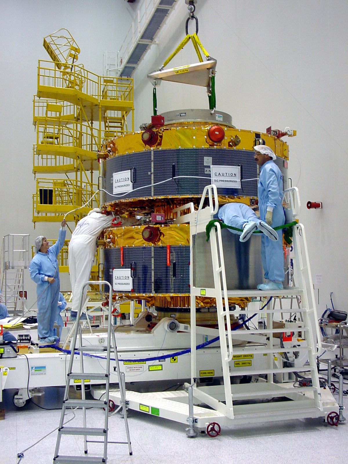 The Cluster spacecraft FM6 and FM7 are being stacked together inside the Upper Composite Integration Facility (UCIF) clean room. They remain together until they are placed into orbit.