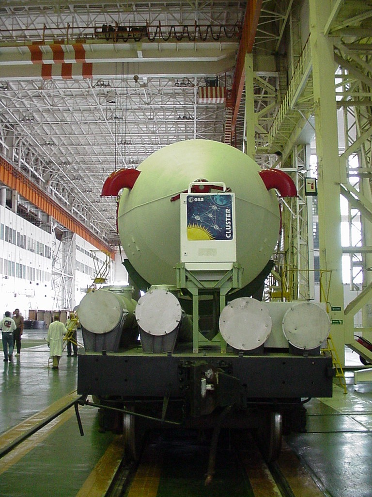 Upper Composite Integration Facility (UCIF) to a train platform, for later transportation to the "MIK 40" facility for integration onto the Soyuz rocket.