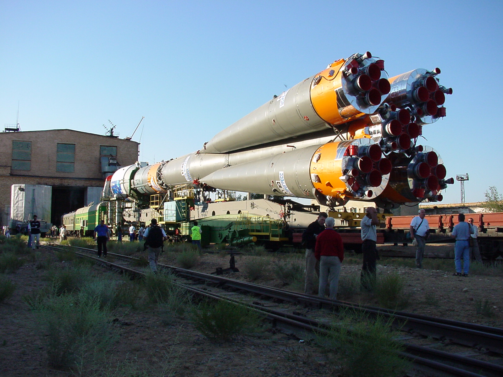 Shortly after sunrise, at 7:30 this morning (as always for any Soyuz roll-out since the first one), the doors of the Launch Vehicle Integration Hall opened, and rollout of the launch vehicle to the pad commenced.