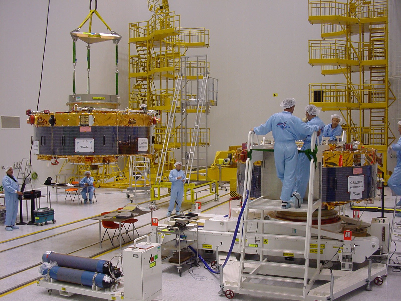 Date: 22 July 2000 Satellite: Cluster Depicts: Rumba and Tango spacecraft Location: UCIF clean room, Baikonur, Kazakhstan Copyright: ESA Show in archive: true