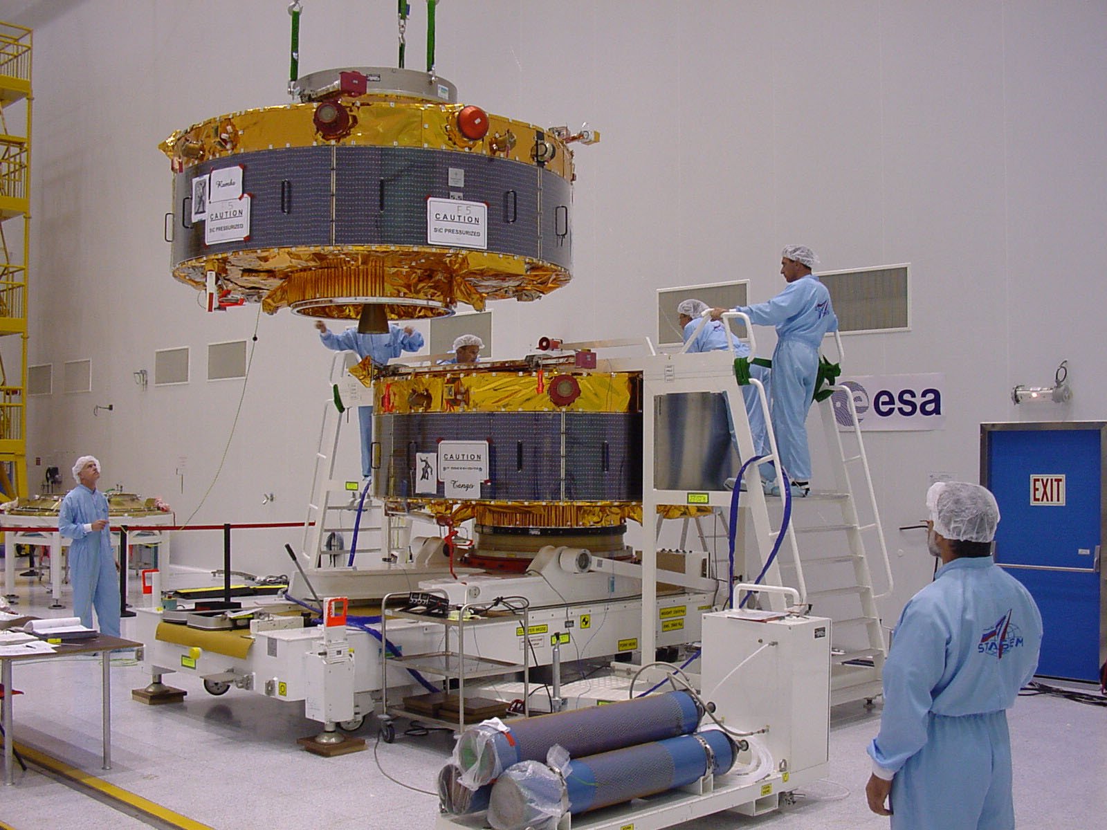 Date: 22 July 2000 Satellite: Cluster Depicts: Rumba and Tango spacecraft Location: UCIF clean room, Baikonur, Kazakhstan Copyright: ESA Show in archive: true