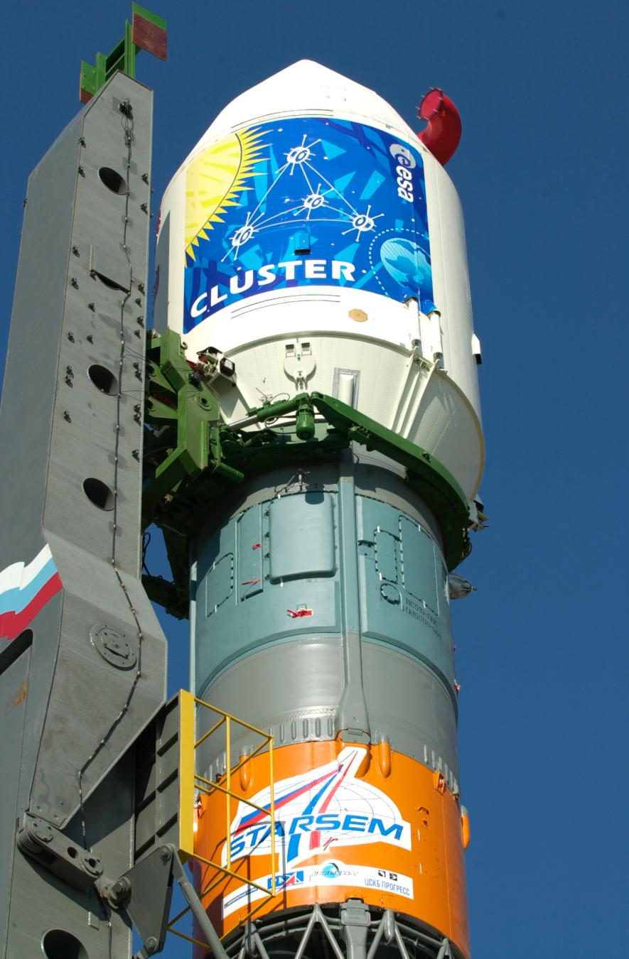 The Fairing containing the first Cluster pair at the top of the Soyuz launcher, standing on the launch pad.