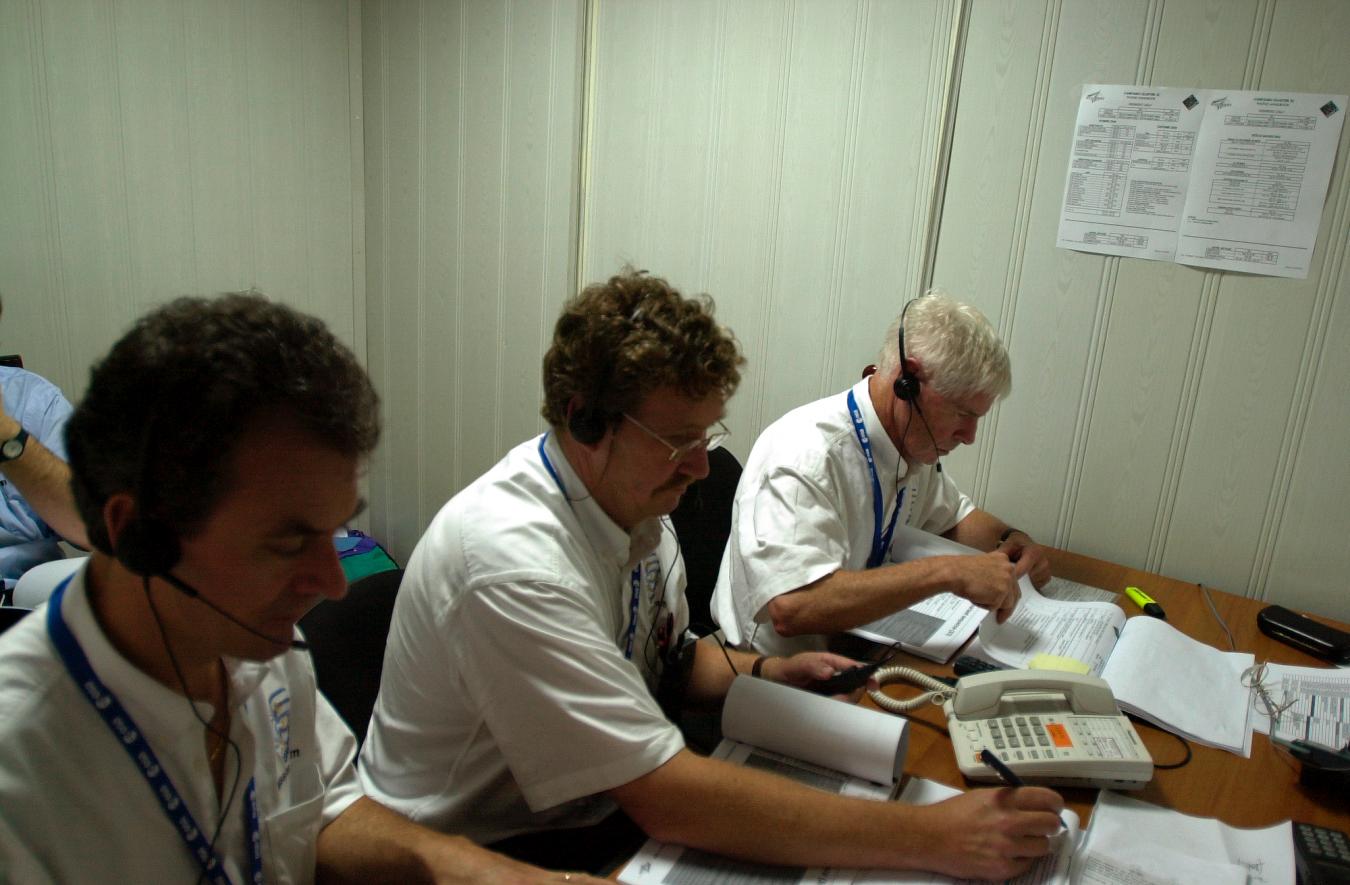 The Communication Cell during the final countdown before launch, with from right to left: Professor Roger Bonnet (ESA Director of Science), John Ellwood (Cluster II project manager) and Alberto Gianolio (Cluster II deputy project manager).