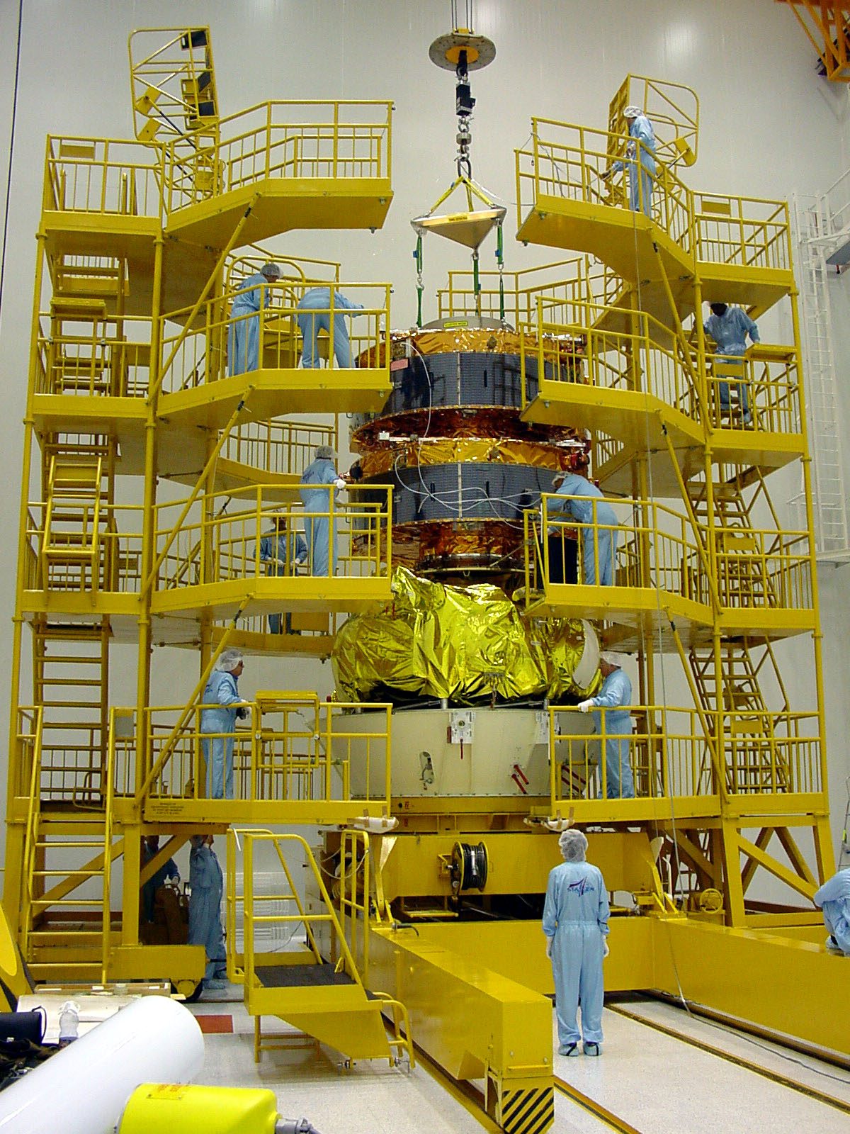 The Cluster stack (Rumba and Tango) is put in place atop the Fregat mounted on its support inside the Upper Composite Integration Facility (UCIF) clean room.