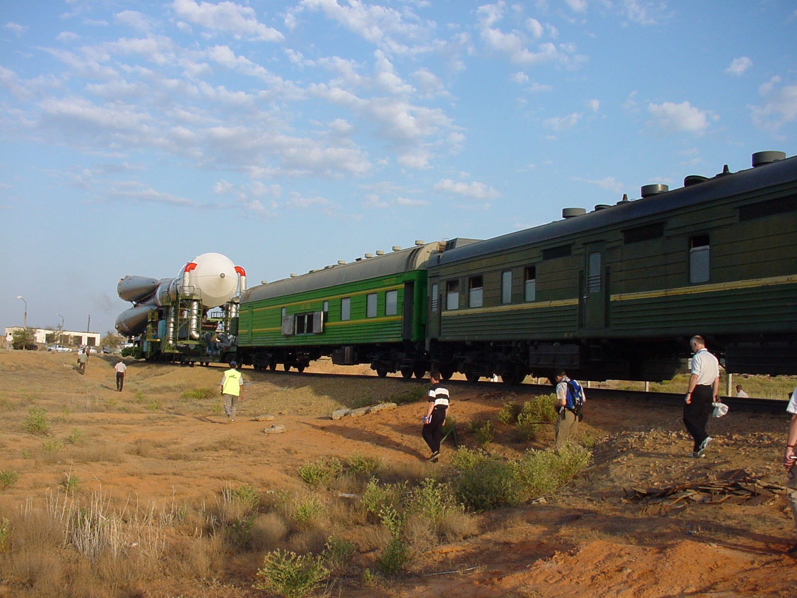The rollout of the Soyuz launcher and second Cluster pair is carried out by train over a distance of about 500 m from the Launcher Integration Building to the launch pad. The train has a special wagon providing air-conditioning to the Cluster pair inside the fairing.