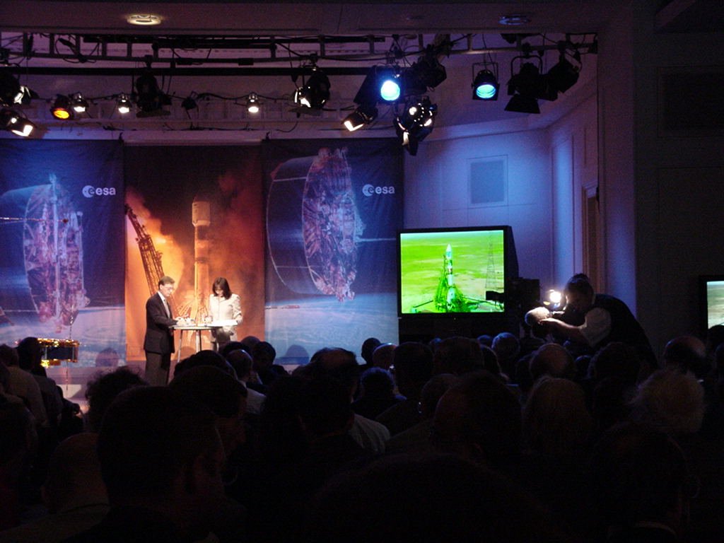 Howard Nye, ESOC Ground Segment Manager, Katie Haswell, presenter, at the Cluster press event, Royal Society, London, 9 August 2000.