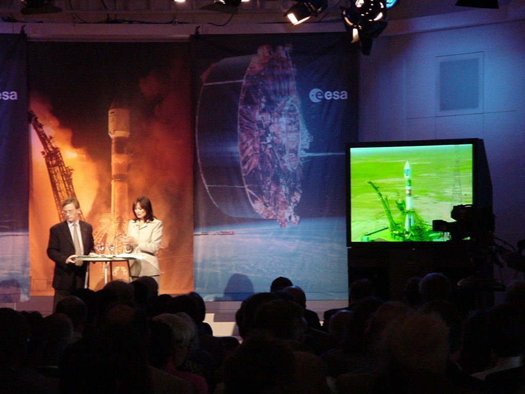 Howard Nye, ESOC Ground Segment Manager, Katie Haswell, presenter, at the Cluster press event, Royal Society, London, 9 August 2000.