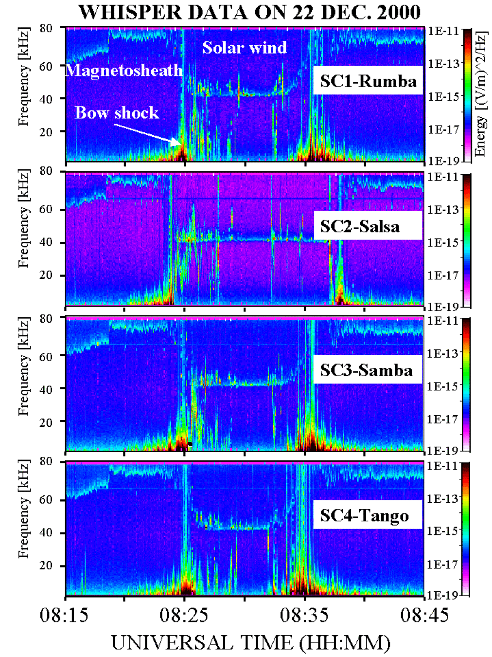 The frequency/time spectrogram data were obtained between 08:15 and 08:45 GMT (09:15 - 09:45 CET) on 22 December 2000. Each spacecraft crossed the bow shock (red/black peaks) at slightly different times, but the crossings generally occurred at around 08:25 and 08:35 GMT (09:25 and 09:35 CET). At that time, spacecraft 2 (Salsa) was more westward than the other three spacecraft, and so it spent more time in the solar wind.