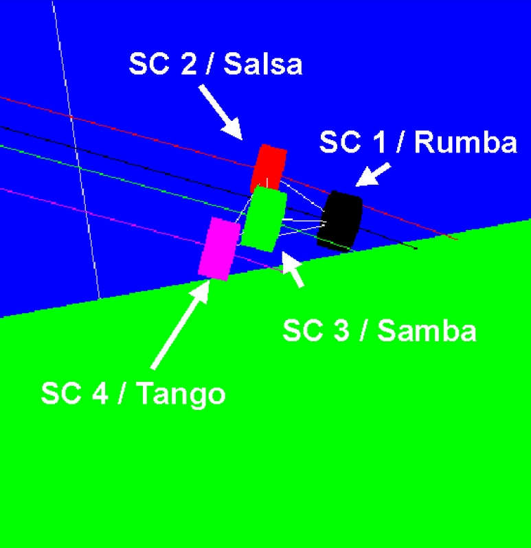 The spacecraft are in a tetrahedral configuration (triangular pyramid) and are giving