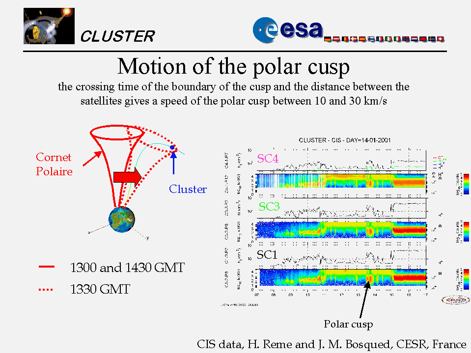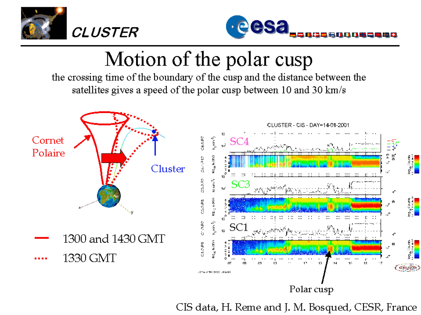 These data plots from the CIS experiment on three Cluster spacecraft show the measured population of ions (charged particles) with energy from about 30 eV up to about 30 KeV between 07 and 17 GMT on 14 January 2001. The polar cusp was encountered between 13:30 and 13:50. Detailled comparison of the data on the different spacecraft indicates that the polar cusp was moving toward the Cluster spacecraft at a speed between 10 and 30 kms-1. The motion of the cusp in relation to Cluster is shown on the left.