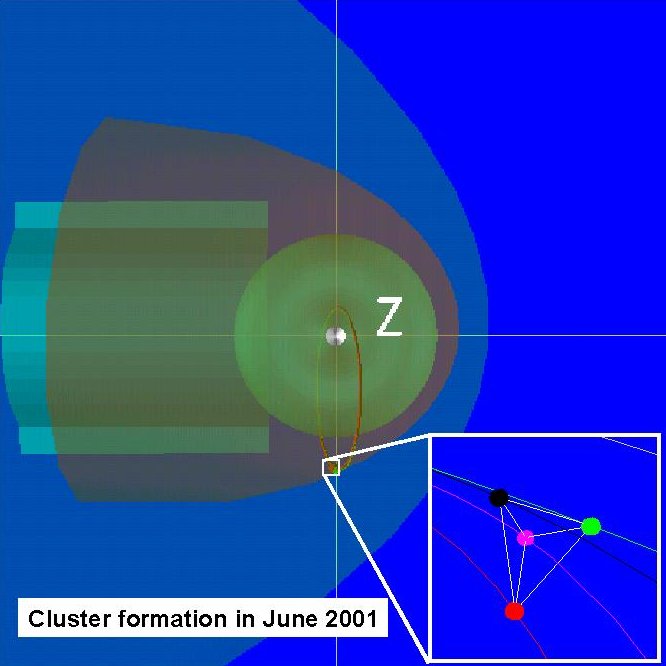 The interspacecraft distance will be 2000 km and the tetrahedron will be located at apogee. The Cluster orbit is indicated in red.
