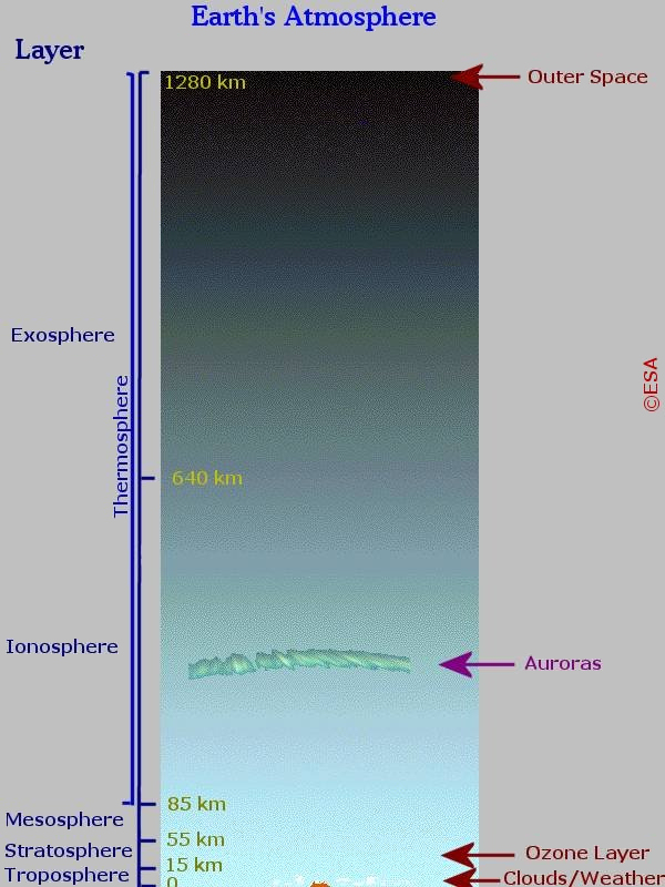 Diagram showing the layers of the Earth's atmosphere and an indication of the altitude of aurorae.