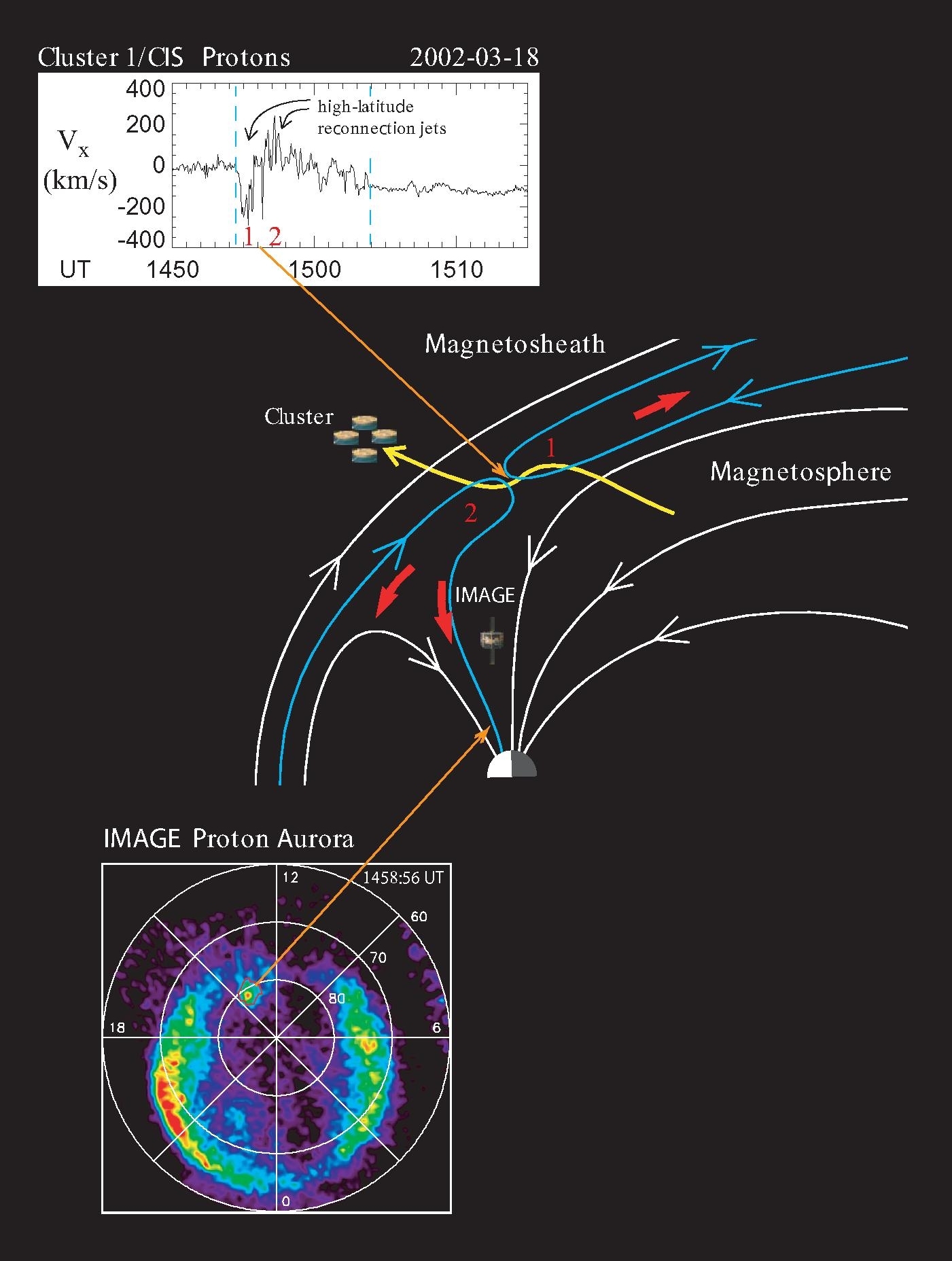 This illustration shows the configuration of spacecraft and the Earth at the time that the observations were made of a breakthrough of protons. On 18 March 2002, NASA's IMAGE was closer to the Earth and observing an aurora that contained a dayside proton auroral spot (see bottom left picture). At the same time, ESA's Cluster quartet then passed overhead returning proton data (see top left graph) that showed a magnetic reconnection was taking place and that protons were leaking through Earth's magnetic shield. These protons were then being funnelled into Earth's atmosphere along the magnetic field to form the spot.