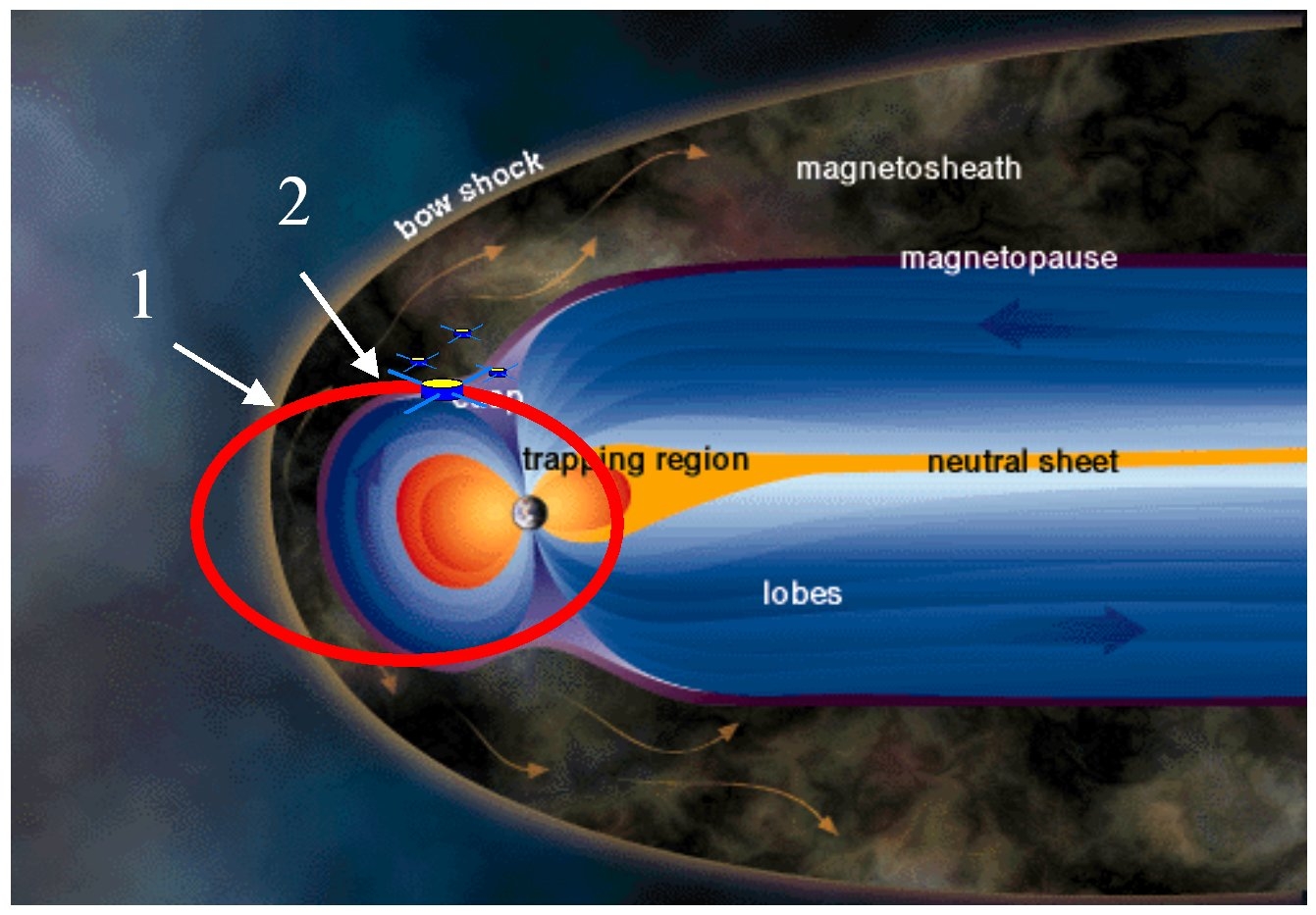 Orbit of Cluster (red ellipse) drawn over a sketch of the Earth's magnetopshere. Key regions of the dayside magnetosphere are the bow shock (1) and the magnetopause (2) that are frequently encountered by the four Cluster satellites.