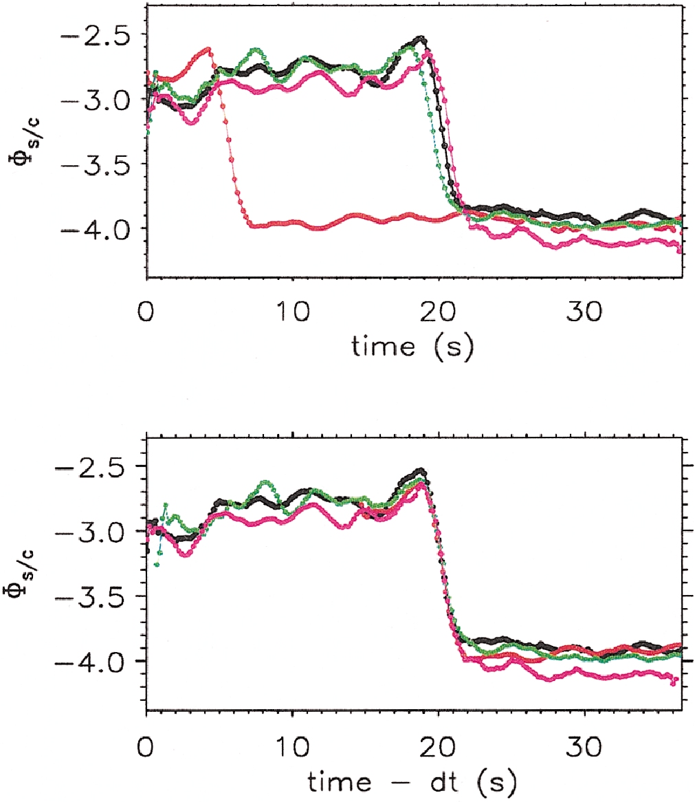 Smoothed spacecraft potential measurements -ΦSC from the four Cluster spacecraft (each as a different color: black: 1; red: 2; green: 3; purple: 4), at a collisionless shock. The time shift between encounters on the 4 spacecraft is used to compute the shock normal vector and speed. Notice the coherence of the first cycle of the overshoot. [Bale et al., Phys. Rev. Lett. 91, 265004 (2003)].