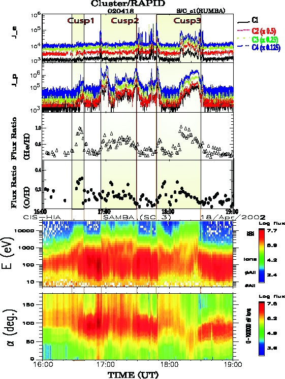 Particle observations made by the four Cluster spacecraft during the time period of 16:00 to 19:00 UT. The top two panels are flux of energetic electrons and protons from RAPID. The third and fourth panels display the flux ratios. The fifth and sixth panels display the lower energy ion spectra and their pitch angles obtained by the Cluster Ion Spectrometry (CIS) instrument.