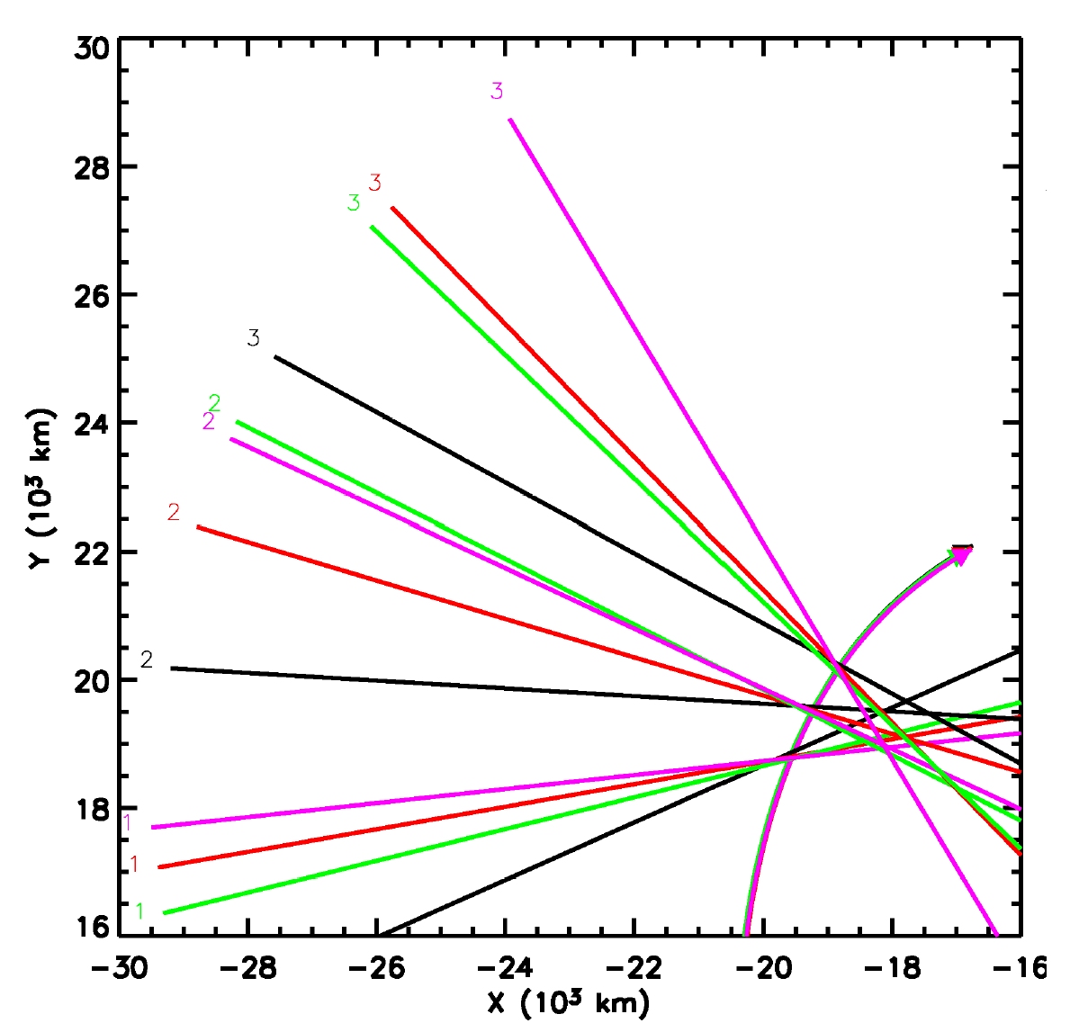 Directions for the four spacecraft (lines in black, red, green and purple colours) are shown at three instants (1, 2, 3 labels). Although spanning a large angular domain, they all point to the same region, placed between the orbit and the Earth. (The Earth is at the origin in this coordinate system.)
