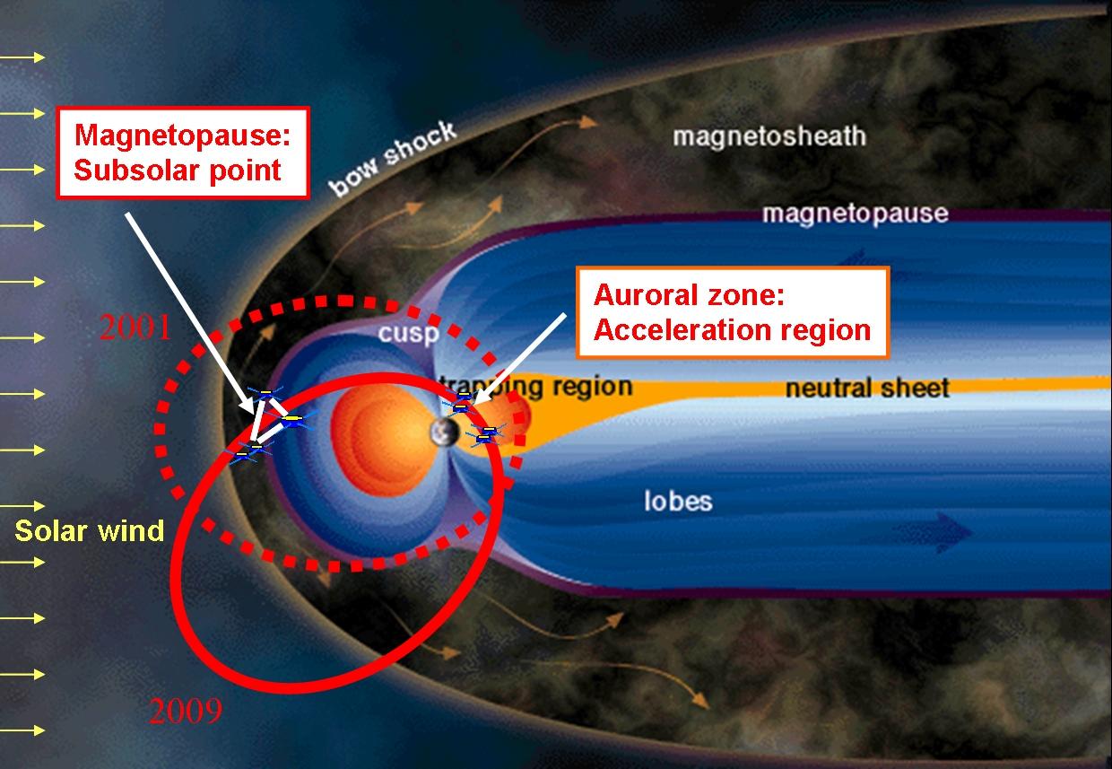 Comparison of Cluster orbit in 2009 (solid) and 2001 (dashed). On the dayside, the 2009 orbit passes through the subsolar magnetopause and the auroral acceleration zone.