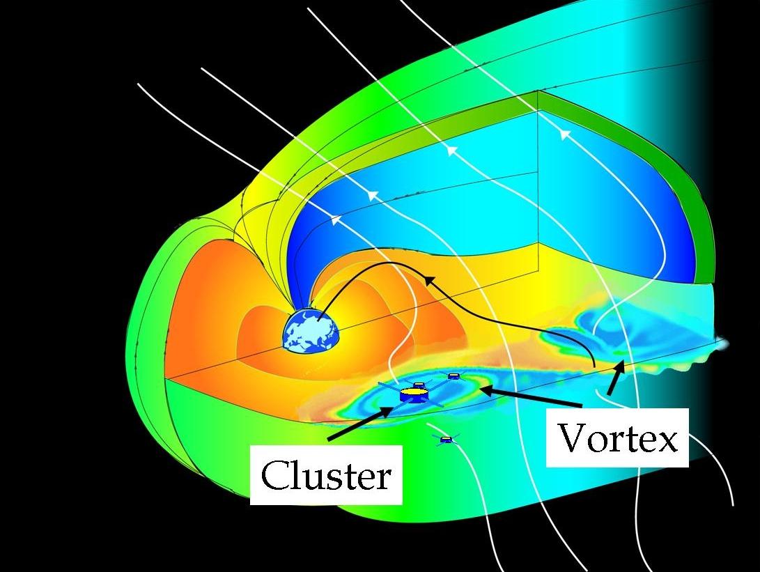Three-dimensional (3D) cutaway view of Earth's magnetosphere, showing signatures of Kelvin-Helmholtz instability (KHI) with KH vortices at the duskside magnetopause.