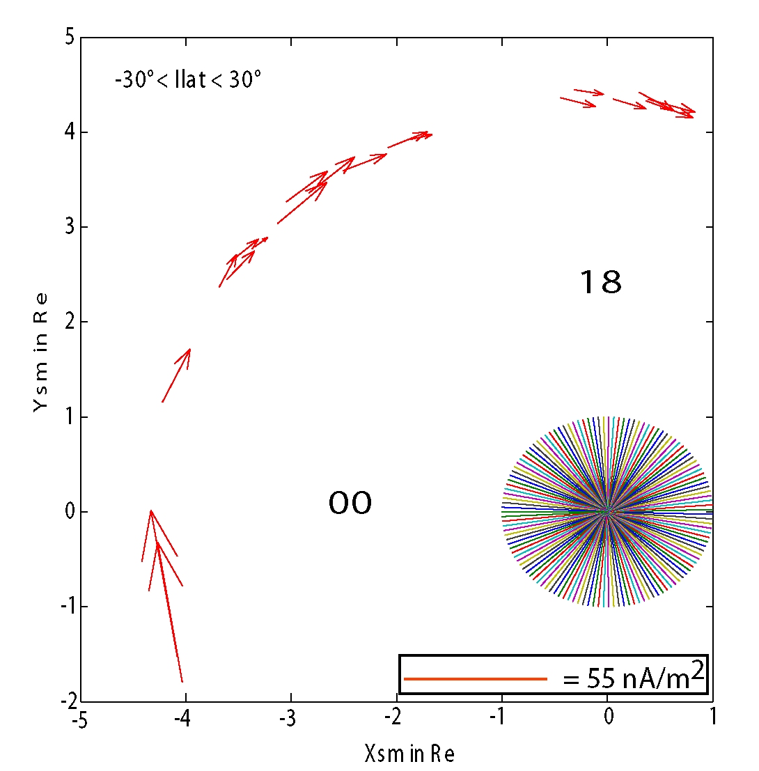This plot shows the current density vectors extracted from 19 Cluster perigee passes in the February-June 2002 timeframe, averaged in a ± 30° invariant latitude interval around the equatorial plane, and projected down to the equator. The Earth is indicated by the filled circle at the origin of the plot (radius = 1 Re). Various magnetic activity levels are included. (Figure 15b of [Vallat et al., 2005])