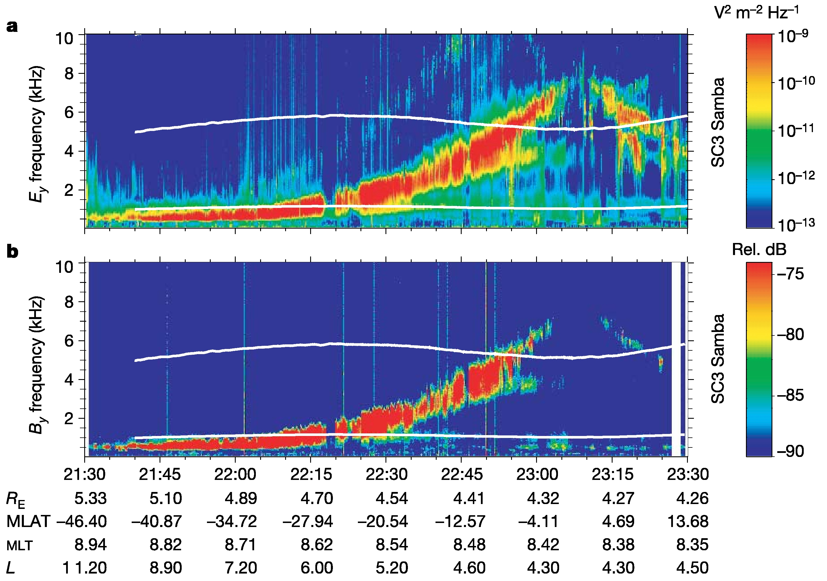 Waves observed by the Cluster spacecraft. Data from the Wideband (WBD) plasma wave instrument on one of the four Cluster spacecraft (Samba) is shown for 31 October 2003. The wave electric field Ey transverse to the ambient magnetic field is shown in a, and wave magnetic field By in b. The colour bars on the right give the calibrated wave power spectral density for the wave electric field (a), and relative wave power spectral density (in dB) for the wave magnetic field (b).