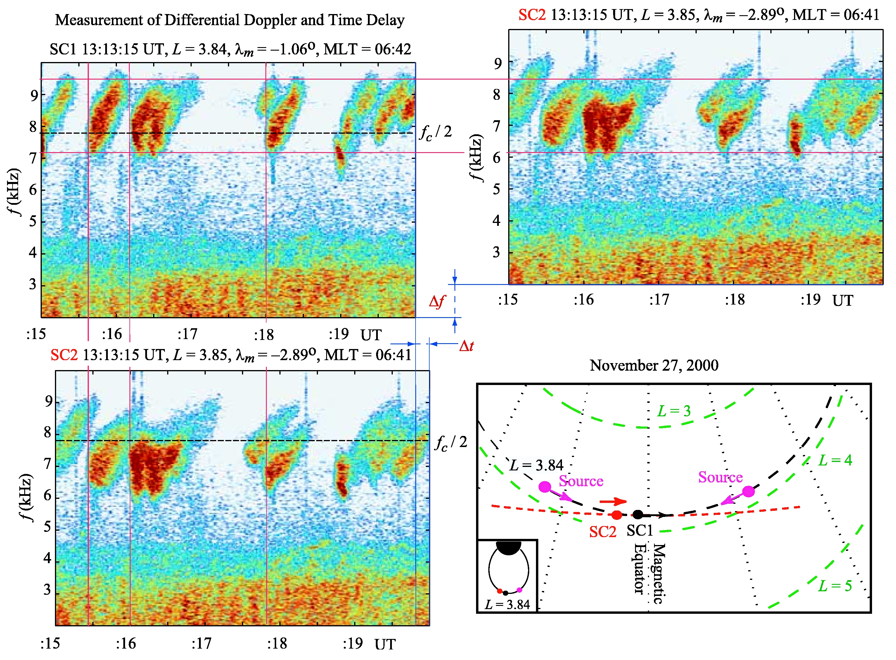 Expanded record of a 5-s-long data segment, starting at 13:13:15 UT, on November 27, 2000, showing a sequence of individual chorus elements observed on both SC1 and SC2. The magnitude scale refers to electric field amplitude with 0 dB corresponding to 1 V/m/√Hz. The SC2 panel is repeated on the right to illustrate the differential Doppler shift. Also shown in the bottom right panel is the location (not shown to scale) of the spacecraft with respect to the two possible source locations (as derived from our analysis) along the field line. The small panel on the bottom left of this diagram shows the entire field to provide perspective.