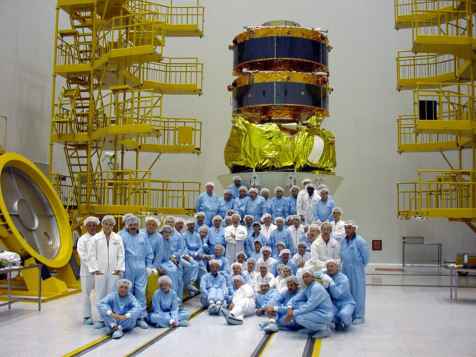 The ESA/Dornier/Starsem/Lavotchkin/Clemessy and Aerospatiale team in front of the Fregat/Cluster stack in the Upper Composite Integration Facility (UCIF) clean room.