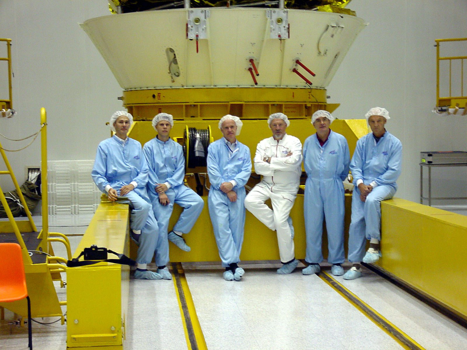 The ESA team in front of the Fregat/Cluster stack in the Upper Composite Integration Facility (UCIF) clean room. From left to right: Daniel de Chambure, Markus Ranne, Colin Parkinson, Gerard Melchior, Walter Pinter-Krainer and Arrien Tiemon.