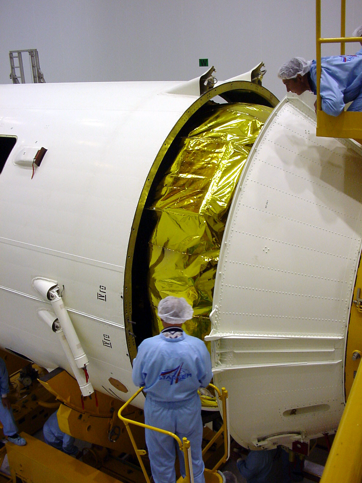 After checking correct clearance, under close supervision of the technicians, the fairing is carefully moved horizontally until the Fregat and the fairing mechanical interfaces were in contact, with the Cluster stack inside the fairing.
