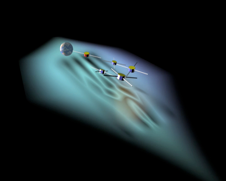 Artistic view of the neutral sheet oscillations observed in the magnetotail by the four Cluster spacecraft (in blue) and the Double Star TC-1 spacecraft in red.