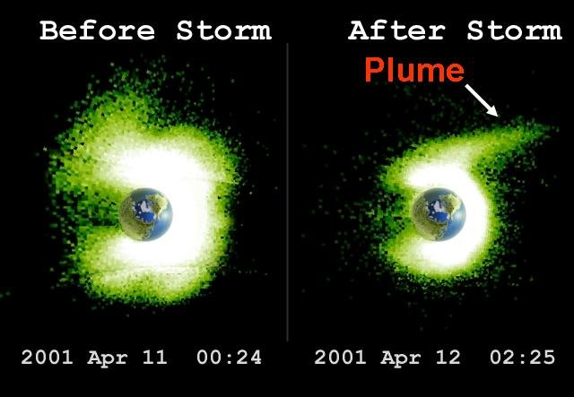 "Before" and "after" illustrations of plasmaspheric erosion caused by the 11 April space storm as measured by the EUV imager onboard the NASA IMAGE mission.