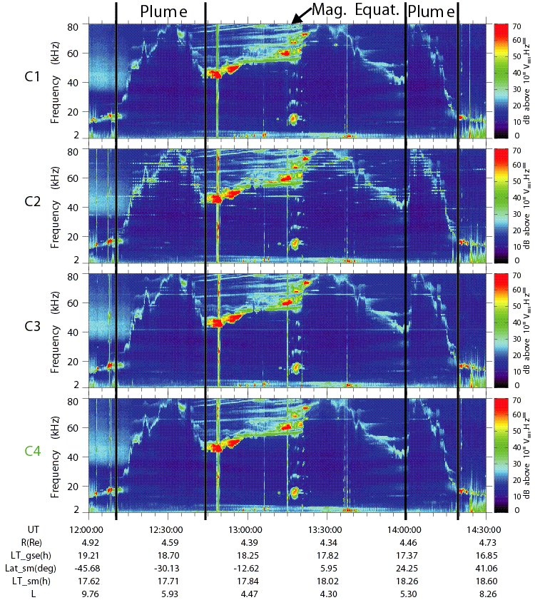 Frequency-time electric field spectrograms measured by the four Cluster/WHISPER instruments on 2 June 2002, showing the entire plasmasphere crossing, including plume traversals in the inbound and outbound passes and the magnetic equator crossed at 13:15 UT. The orbital parameters correspond to C4.