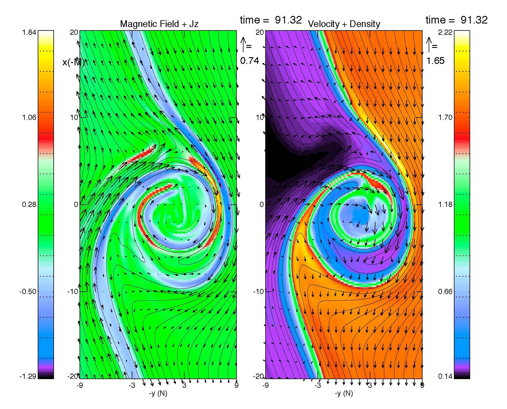 Magneto-Hydro Dynamic simulation result of the Kelvin-Helmholtz wave at t=410 s. The magnetic field (arrows) and the z-component of the current density Jz (colour coded) are plotted on the left panel. The right panel represents the velocity (arrows) and the density (colour coded). The black lines are magnetic field lines.