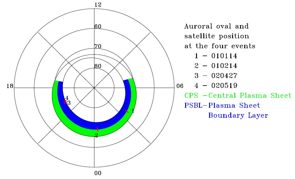 Events 1 and 2 from early 2001 were both located at the boundary between the Central Plasma Sheet (CPS, in green) and the Plasma Sheet Boundary Layer (PSBL, in blue).
