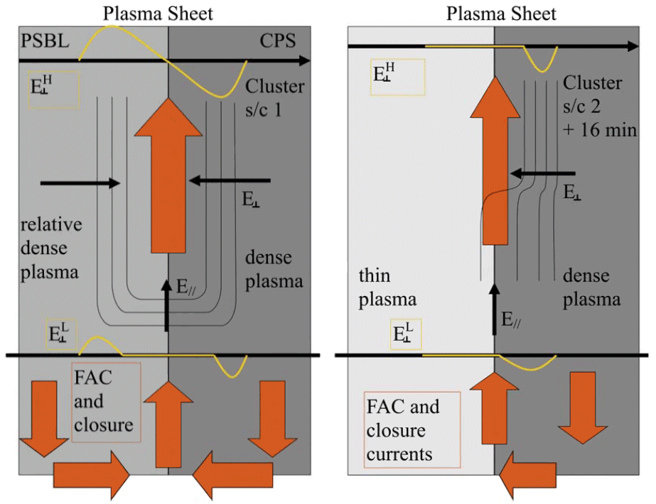 Right: Asymmetric electric current system (orange arrows) and S-shaped potential structure found 16 minutes later by C2 due to the thinning and plasma density depletion in the PSBL.