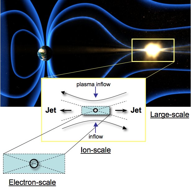Diagram showing the different scales involved in the magnetic reconnection process. When occuring in the Earth's magnetotail, these events accelerate local plasma towards Earth in the form of plasma jets.